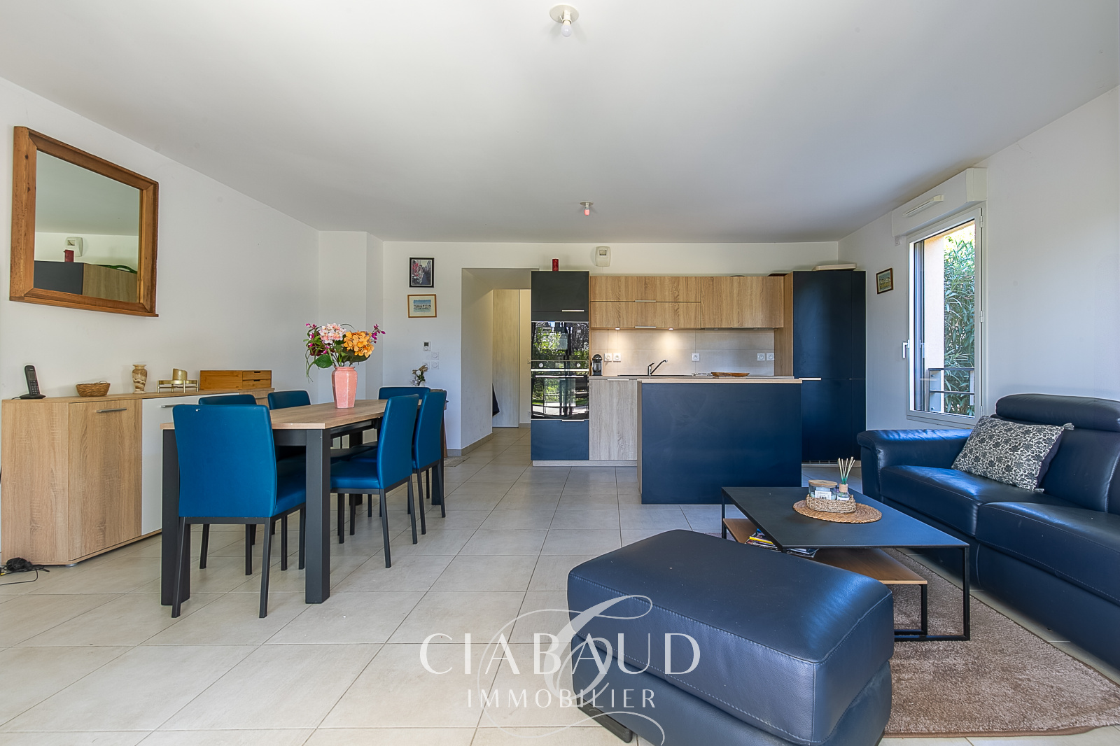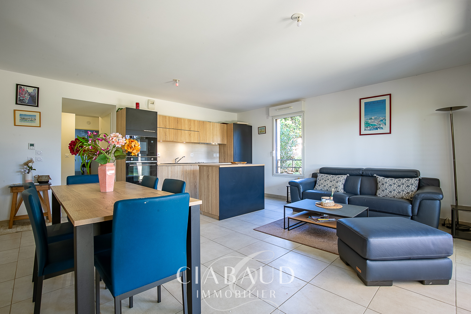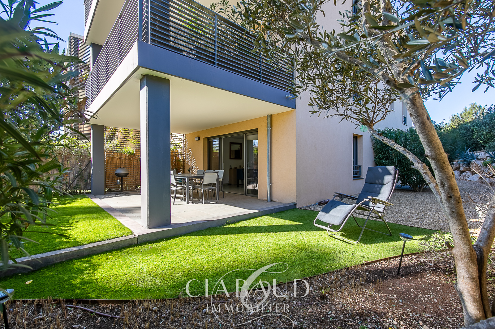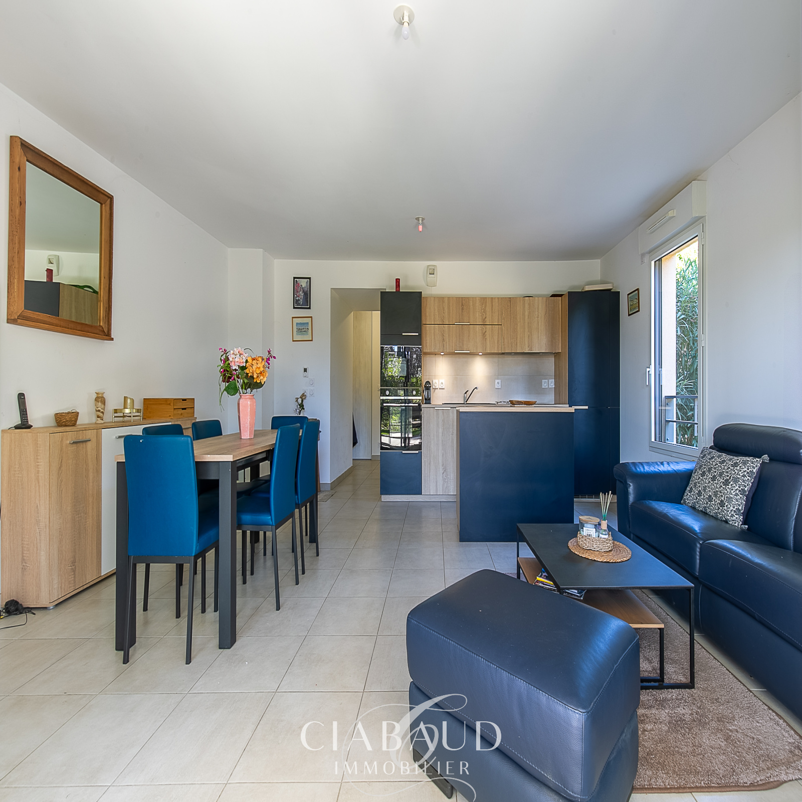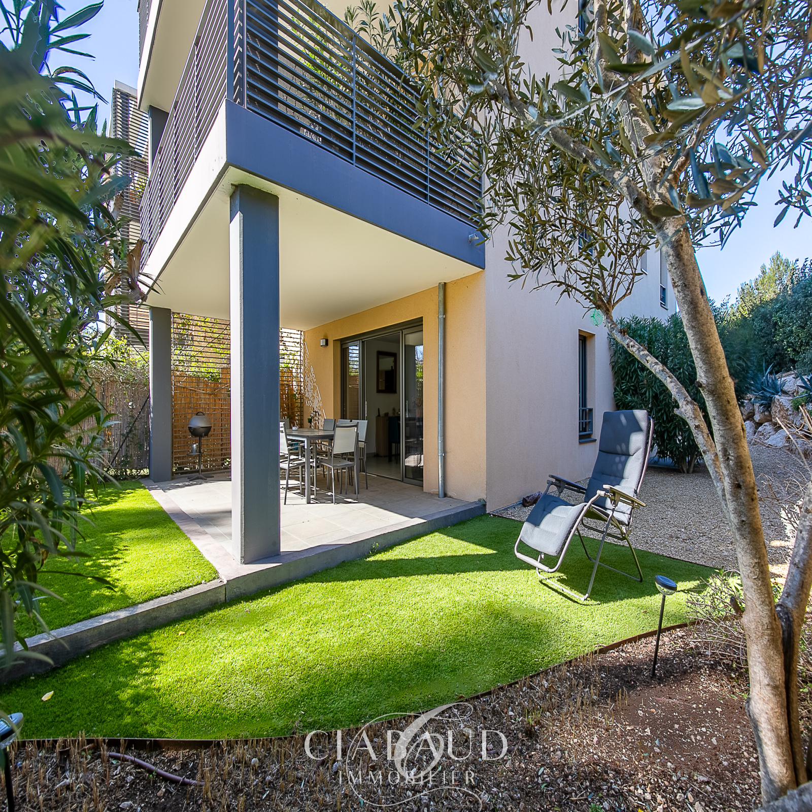 Rare à la vente - Situé au calme et sans vis-à-vis, en plein cœur du village de Luynes, au sud d'Aix-en-Provence, ce rez-de-jardin de type 3 d’une superficie de 71,67 m² avec 210 m² de jardin et un double garage se trouve dans une résidence récente et sécurisée, construite en 2019. Il se compose d’un hall d’entrée avec placard de rangement, d’une grande pièce de vie de 30,94 m² avec cuisine américaine et cellier, de deux chambres, d’une salle de bains et d’un WC indépendant. Prestations de qualité, environnement privilégié avec vue sur un parc paysager en zone naturelle. Charges mensuelles : 190 € (comprenant l’eau froide, l’entretien de la copropriété et du chauffe-eau thermodynamique). Taxe foncière : 1 682 €. Idéal pour un couple ou une personne âgée, cet appartement offre un espace extérieur agréable ainsi qu’un vaste espace de stockage, permettant une occupation confortable sur le long terme. Garantie dommages-ouvrage et décennale en cours. Pour plus d’informations, contactez-nous dès maintenant : CIABAUD Immobilier Luynes au 04 42 53 35 13. CIABAUD IMMOBILIER : agence spécialisée dans la transaction, la location et la gestion locative.