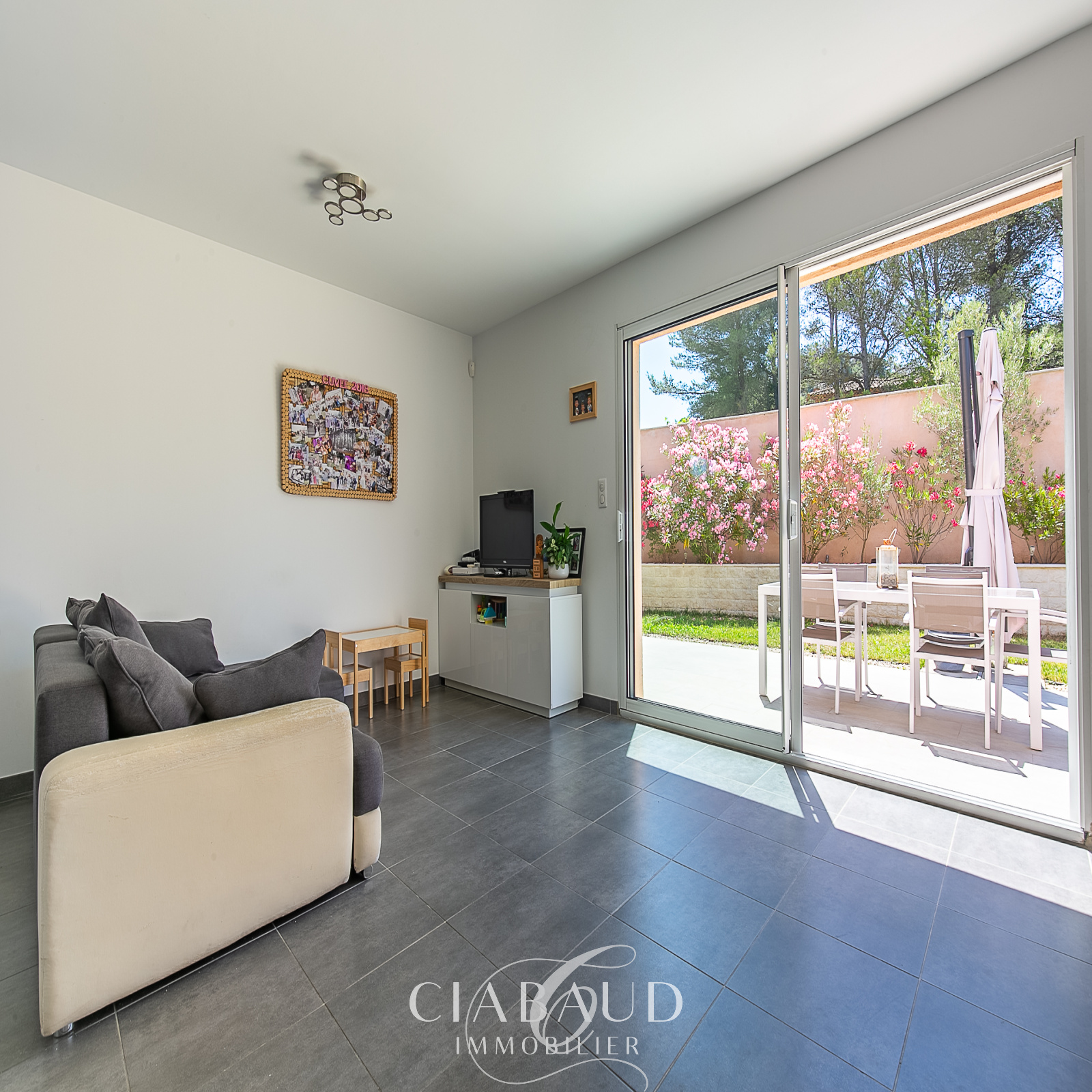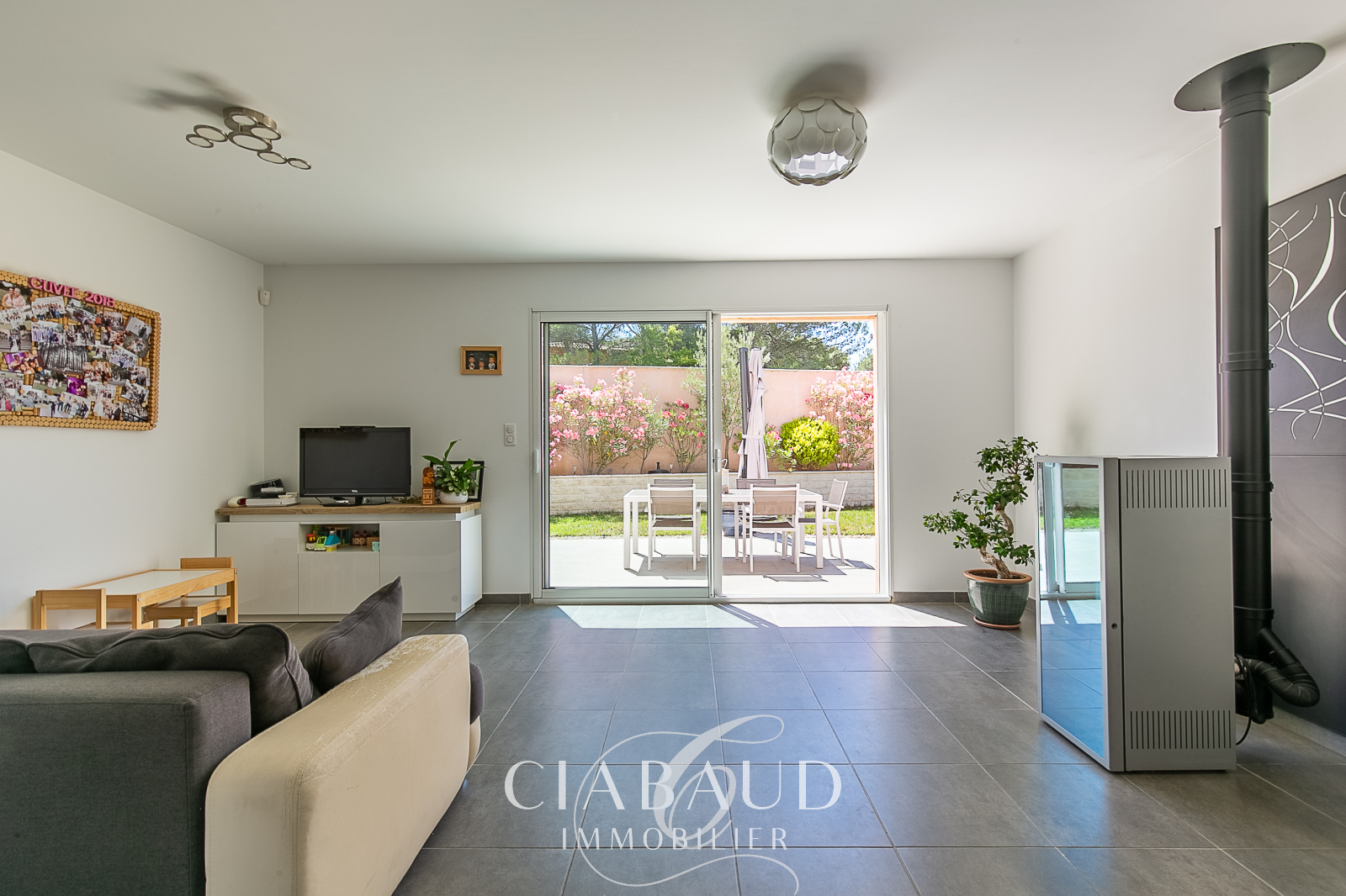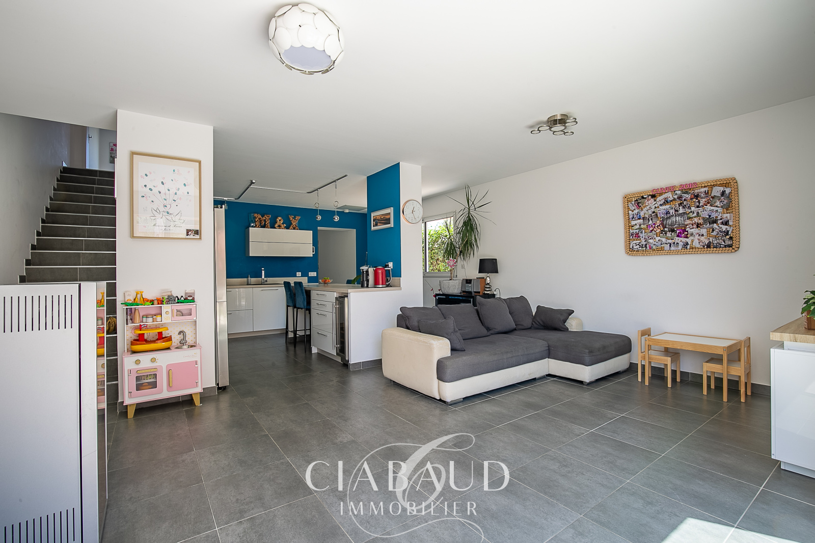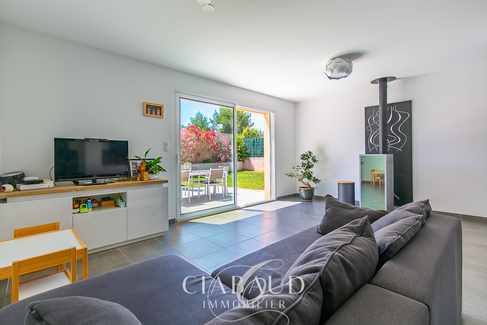 Située à Bouc-Bel-Air, dans une impasse, une maison de type 4 d'environ 100m2 sur un terrain de 482m2 piscinable. Construite en 2017, elle est composée au rez-de-chaussée d'une entrée, d'une grande pièce de vie de 39,26m2 avec poêle à granulés et une cuisine américaine intégrée, d'un cellier, d'un WC avec lave mains et d'une chambre avec possibilité de salle d'eau. À l'étage deux chambres, une salle de bains et un WC séparé. Taxe foncière 1300€. RT 2012, décennale et conformité. Domotique, chauffe-eau thermodynamique et tout-à-l'égout. Proximité transports en commun et commerces. Contact CIABAUD Immobilier Luynes 04 42 53 35 13.