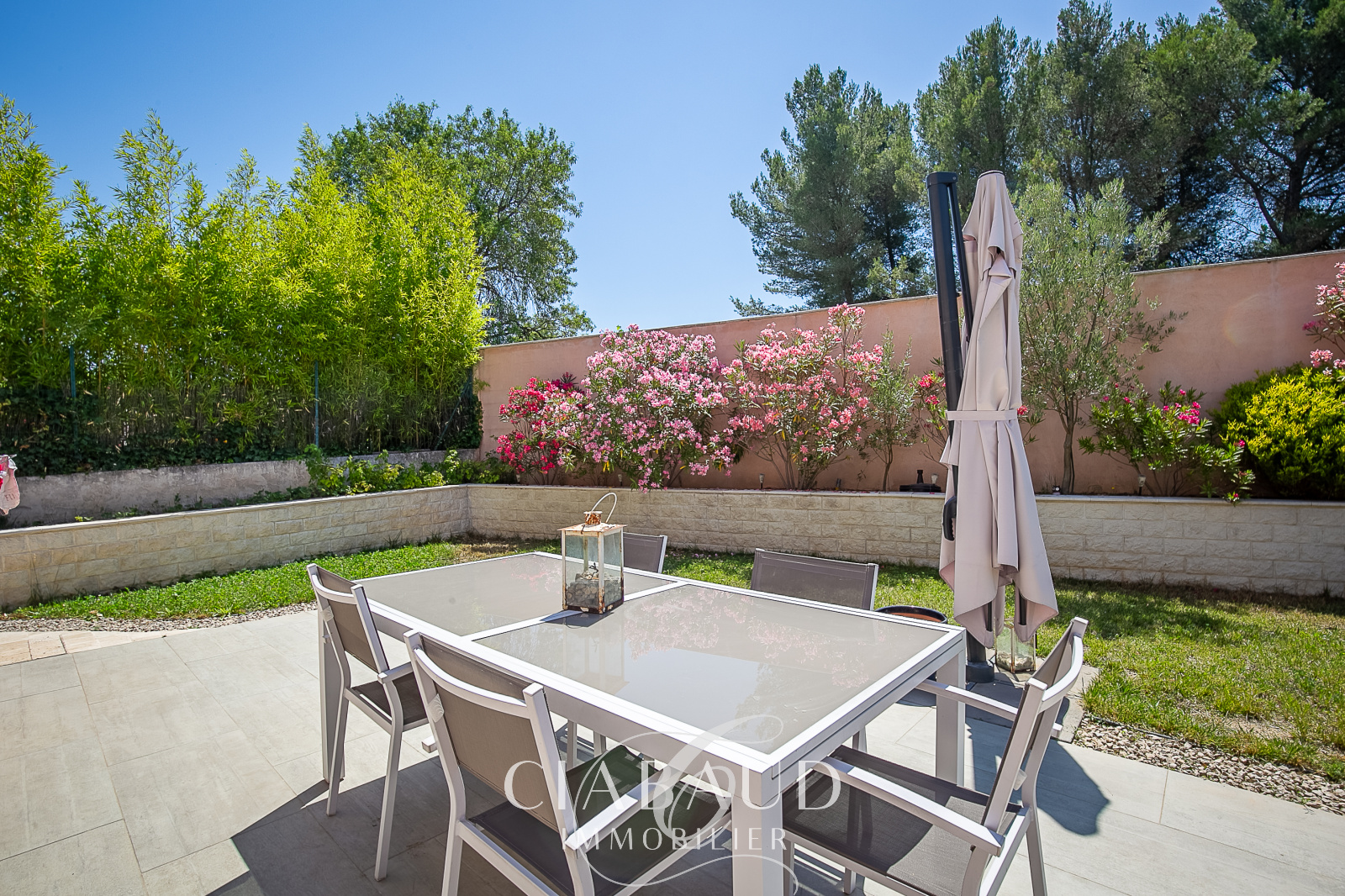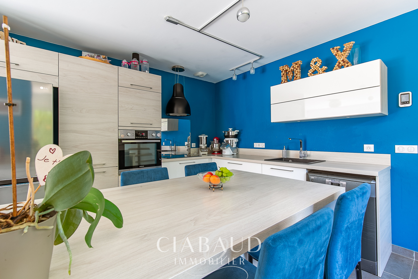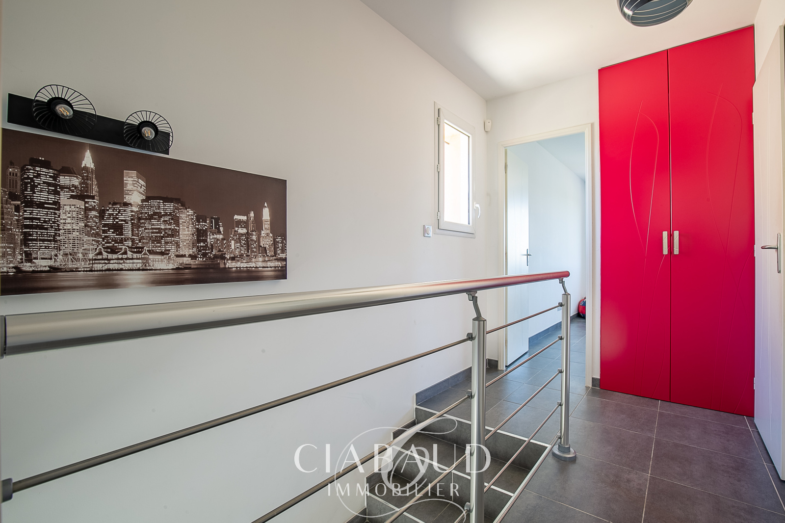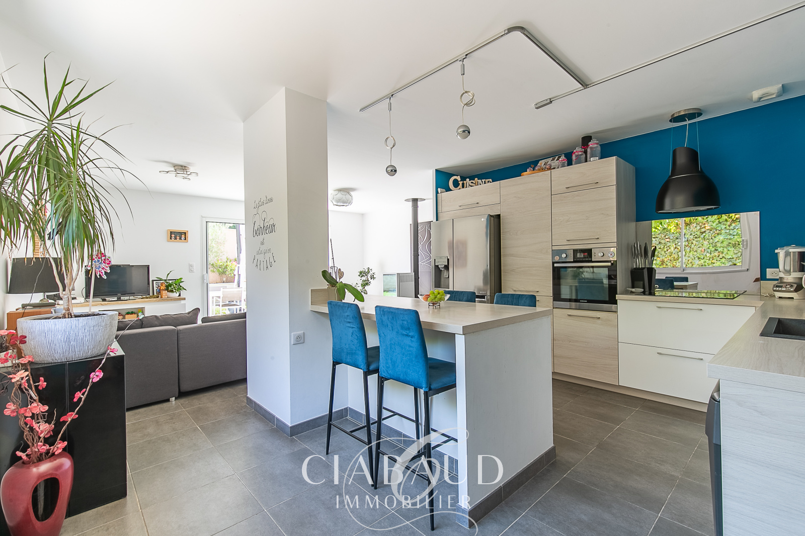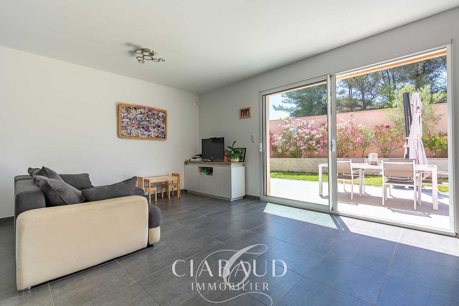 Située à Bouc-Bel-Air, dans une impasse, une maison de type 4 d'environ 100m2 sur un terrain de 482m2 piscinable. Construite en 2017, elle est composée au rez-de-chaussée d'une entrée, d'une grande pièce de vie de 39,26m2 avec poêle à granulés et une cuisine américaine intégrée, d'un cellier, d'un WC avec lave mains et d'une chambre avec possibilité de salle d'eau. À l'étage deux chambres, une salle de bains et un WC séparé. Taxe foncière 1300€. RT 2012, décennale et conformité. Domotique, chauffe-eau thermodynamique et tout-à-l'égout. Proximité transports en commun et commerces. Contact CIABAUD Immobilier Luynes 04 42 53 35 13.