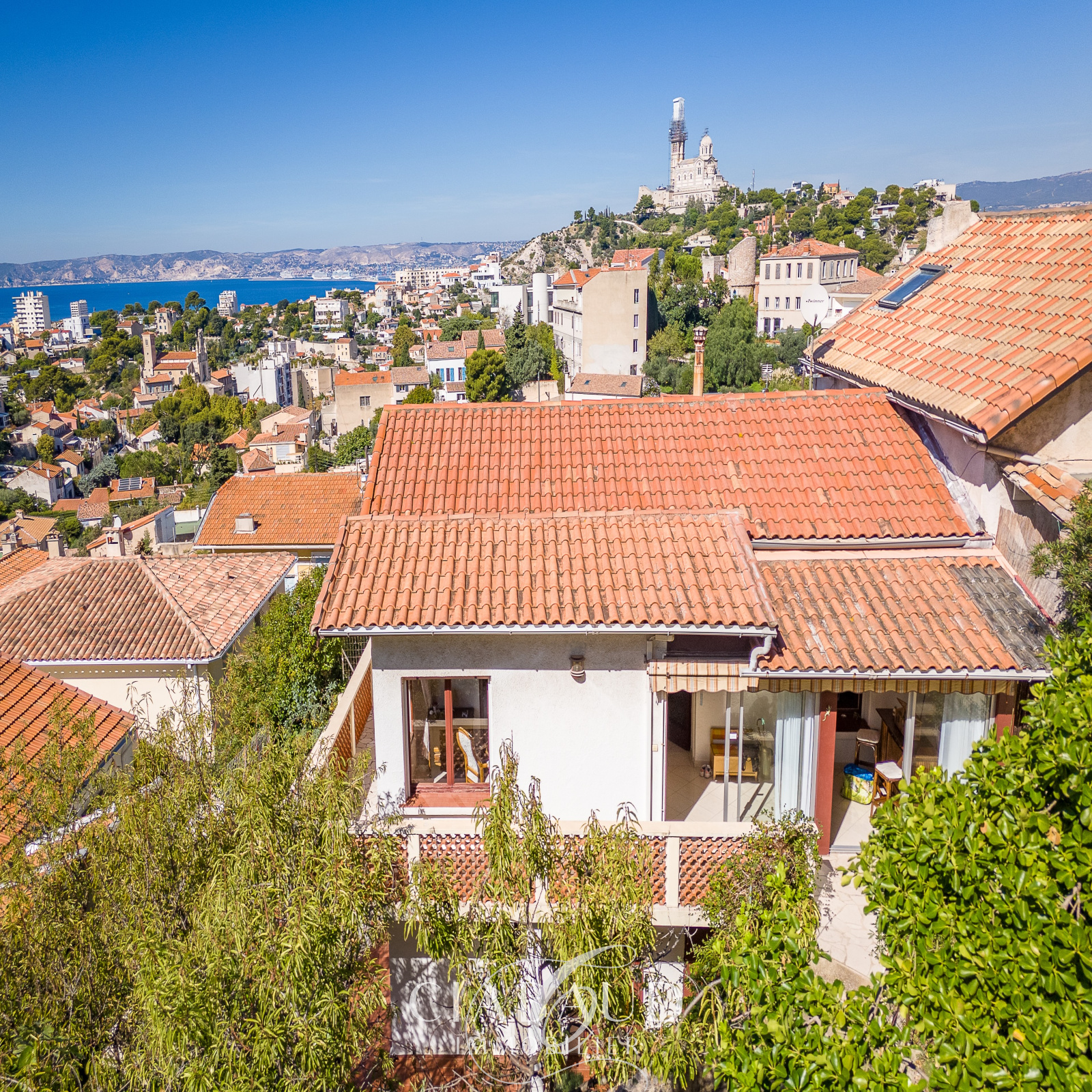 Située en position dominante et au calme, avec une vue mer, dans le quartier du Roucas Blanc, une maison de type 4 de 100 m² avec un grand garage sur un terrain de 530m² offrant un fort potentiel.