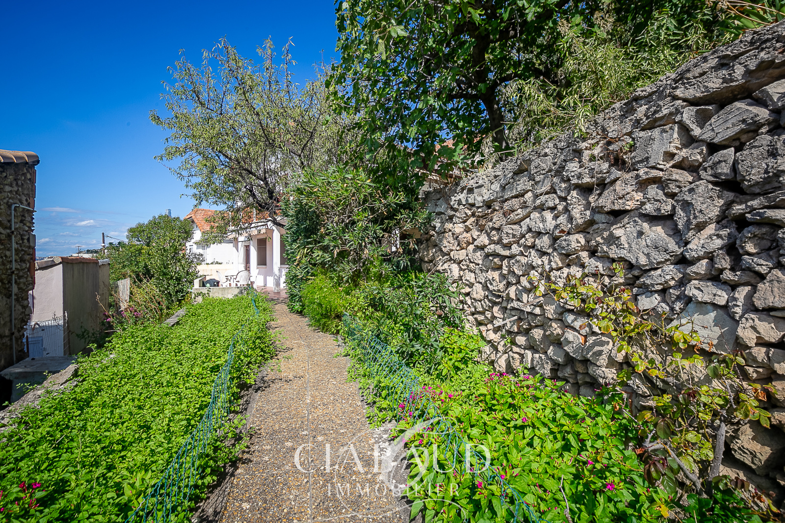 Le terrain, accessible par deux entrées, une piétonne et une voiture qui dispose d’un garage de 30 m² et offre de nombreuses possibilités.