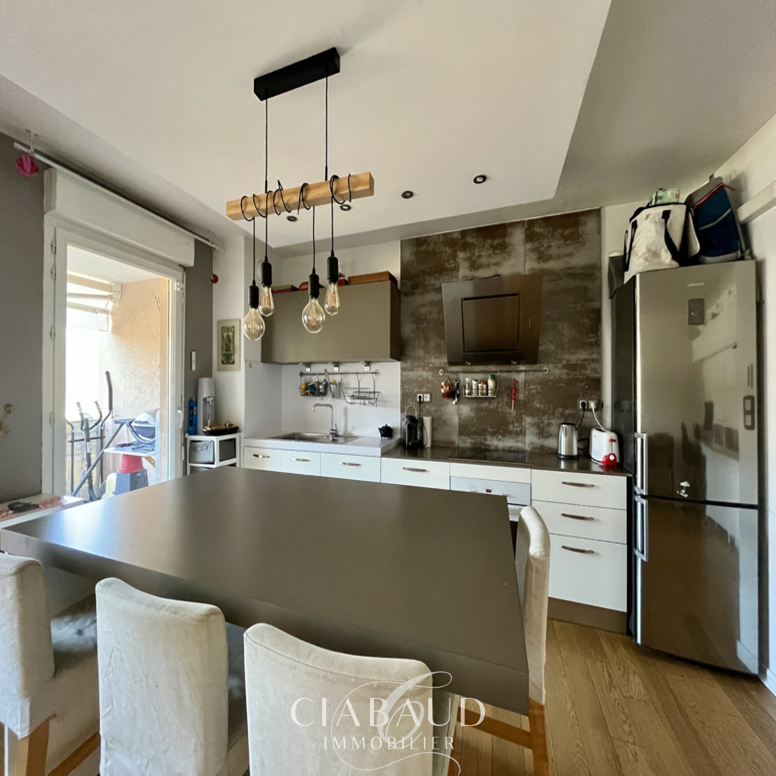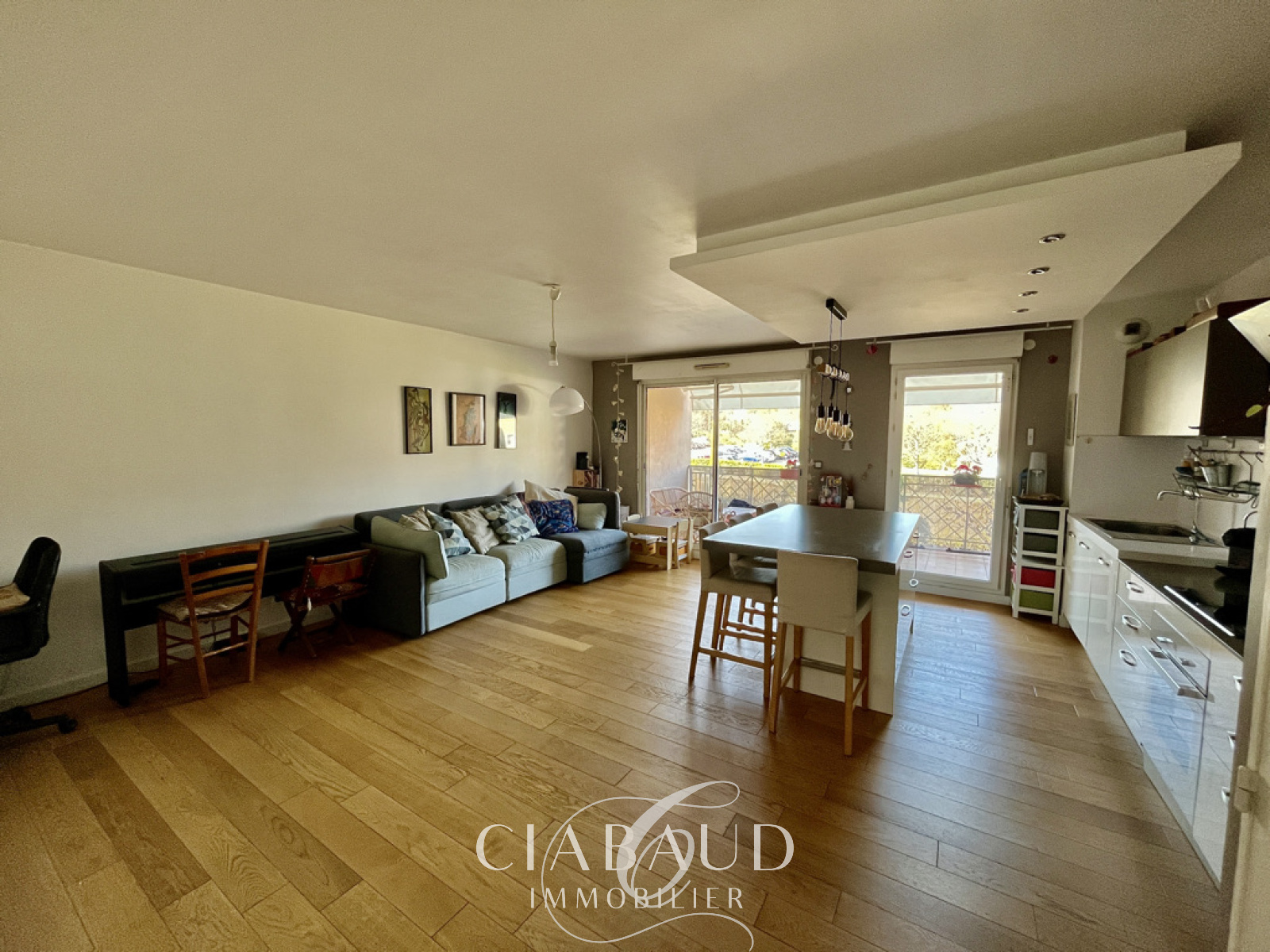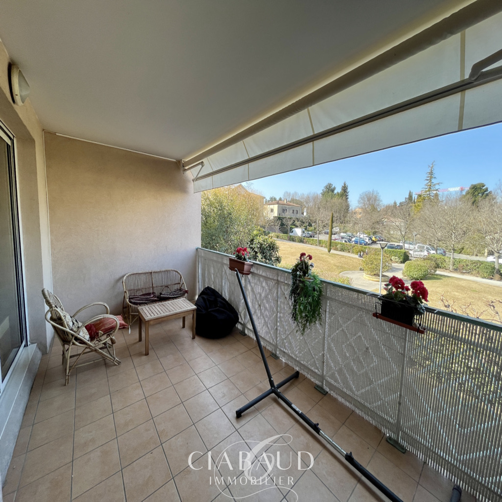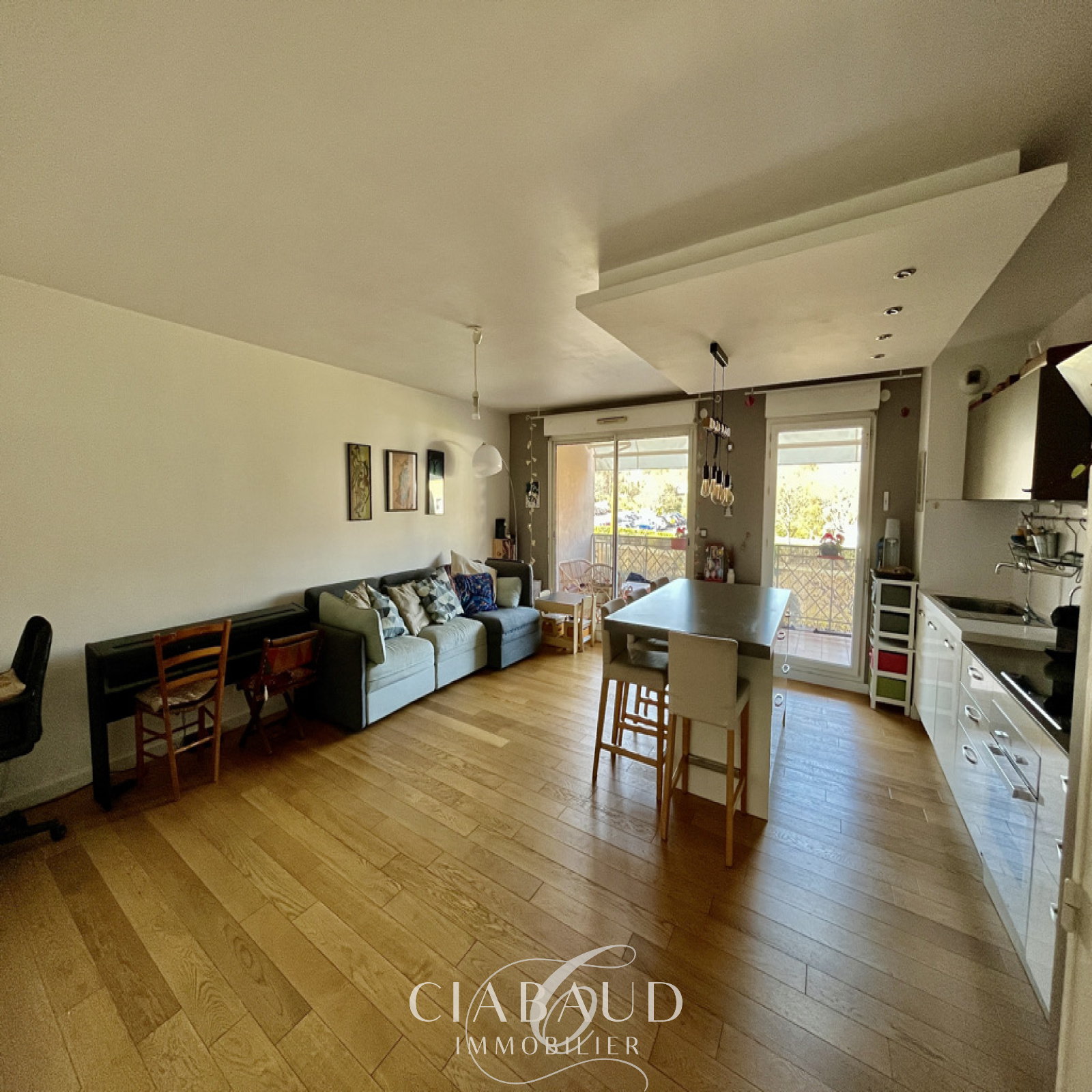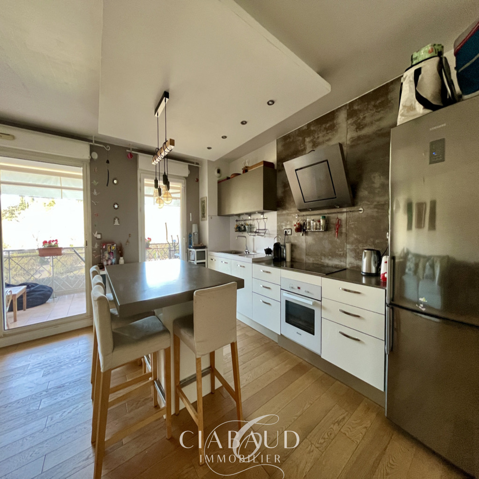 Situé dans le quartier Saint-Mitre à Aix en Provence, au 1er étage avec ascenseur d'une résidence sécurisée. Un appartement rénové traversant de type 3 de 78,37m2 avec terrasses de 15,21m2 et 5m2, une place de stationnement extérieur et un box ouvert. Il est composé d'un hall d'entrée, d'un salon avec cuisine ouverte, de 2 chambres dont une avec terrasse et la seconde avec dressing, d'une salle de bains et d'un WC indépendant. Parquet, double vitrage, VMC, chauffage électrique et climatisation réversible. Charges mensuelles 150€ (comprenant eau froide, entretien de la copropriété). Taxe foncière 943€. Proximité bus et commerces. Contact CIABAUD Immobilier 04 42 53 35 13. Visite virtuelle sur demande.