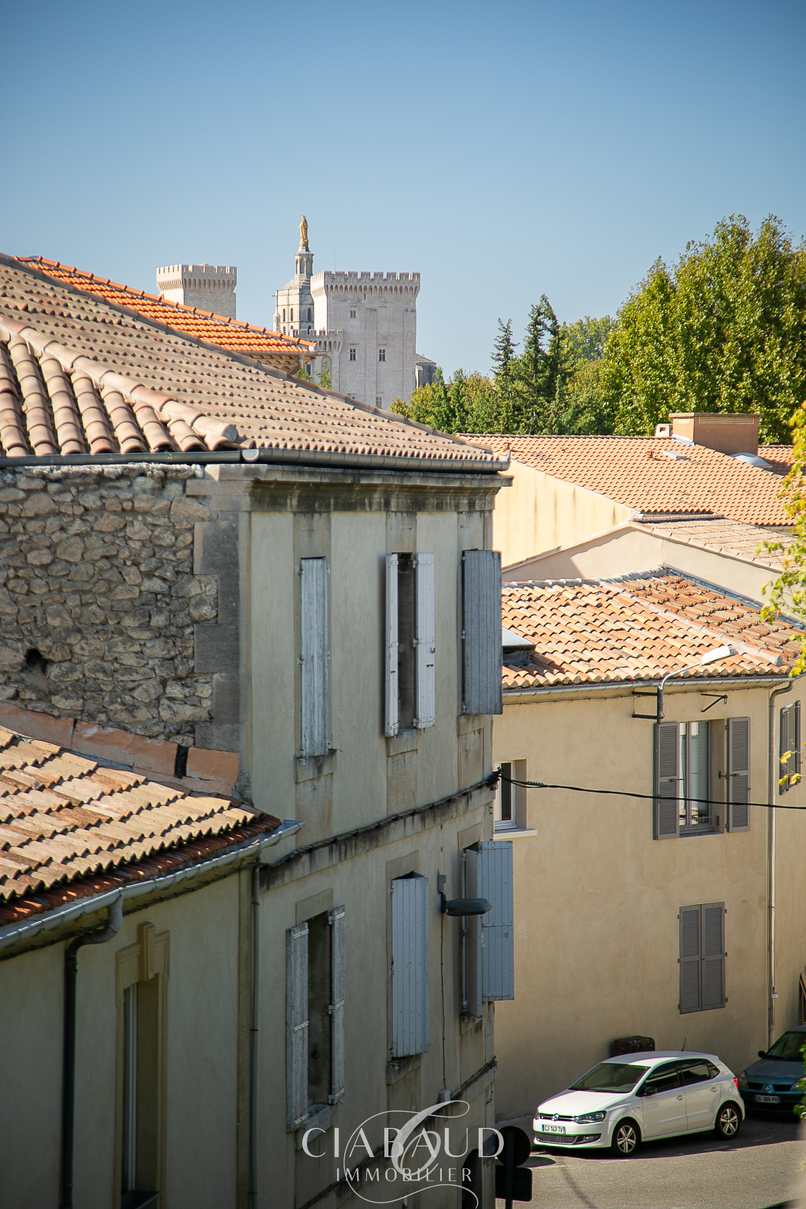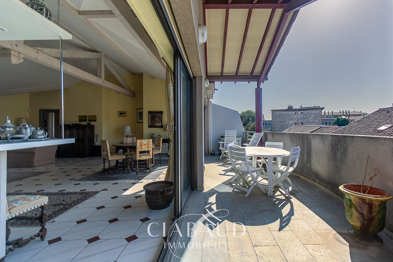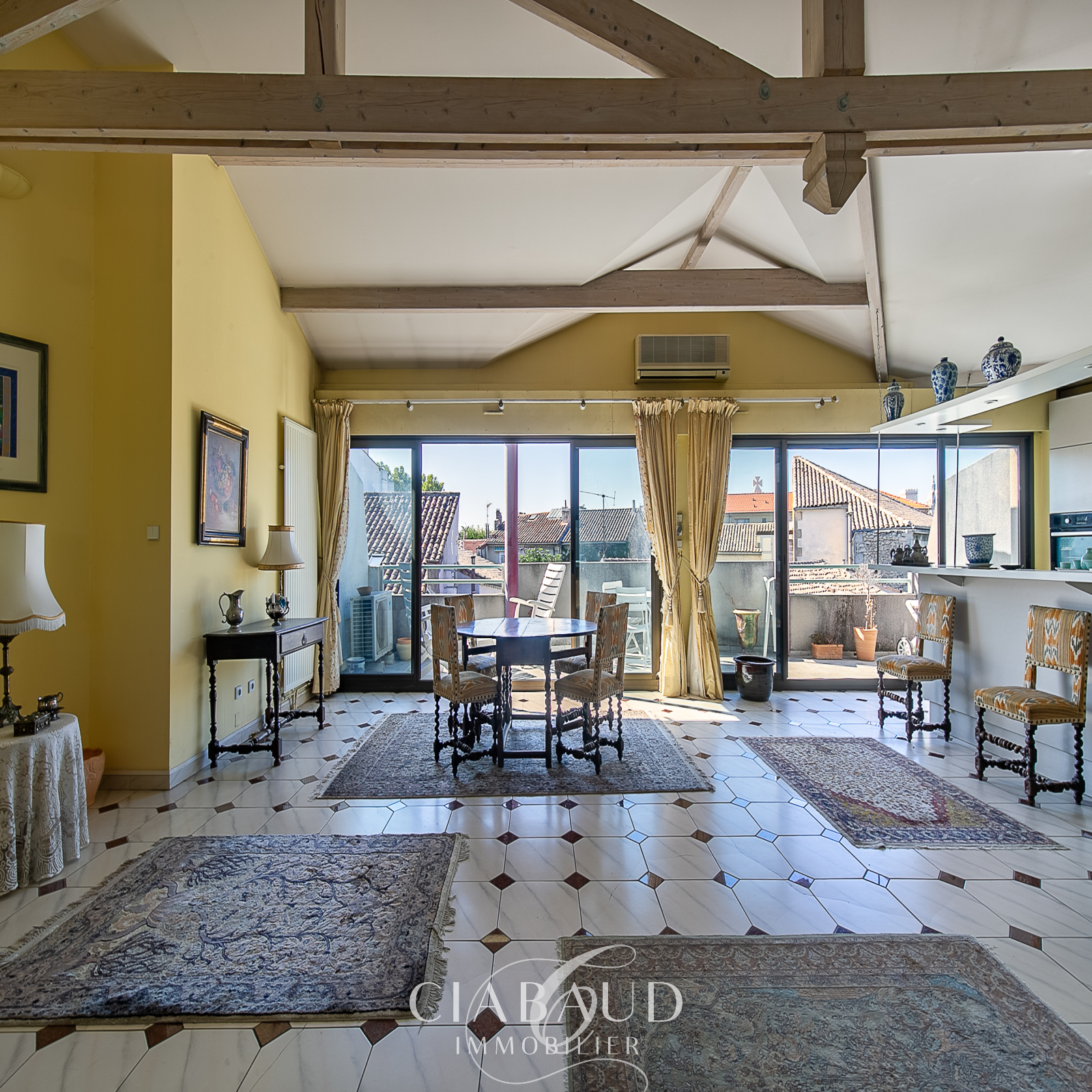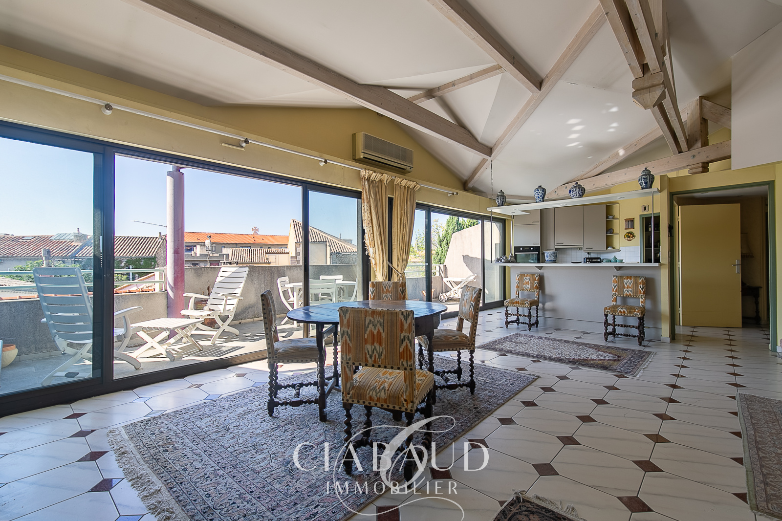 Idéalement situé dans le centre-ville historique d'Avignon, au calme, un appartement de standing avec le potentiel d'un penthouse de type 5 d'environ 153m2 avec terrasses, double garage et cave. Seul au dernier étage d'un immeuble des années 90 avec ascenseur, cet appartement avec ses beaux volumes et ses nombreuses terrasses vous permet de profiter de plusieurs expositions ainsi qu'une vue sur le Palais des Papes. Il est composé d'une grande pièce de vie traversante et climatisée de 66,5m2 avec cuisine américaine avec de grandes ouvertures sur la terrasse et une arrière-cuisine. Attenant une suite parentale d'environ 35m2 avec salle de bains, dressing, WC indépendant et un accès terrasse. Côté nuit, 2 chambres avec placard et accès terrasse, un bureau, deux salles d'eau et un WC indépendant. Chauffage individuel gaz et climatisation. Contact CIABAUD IMMOBILIER 04 42 53 35 13.