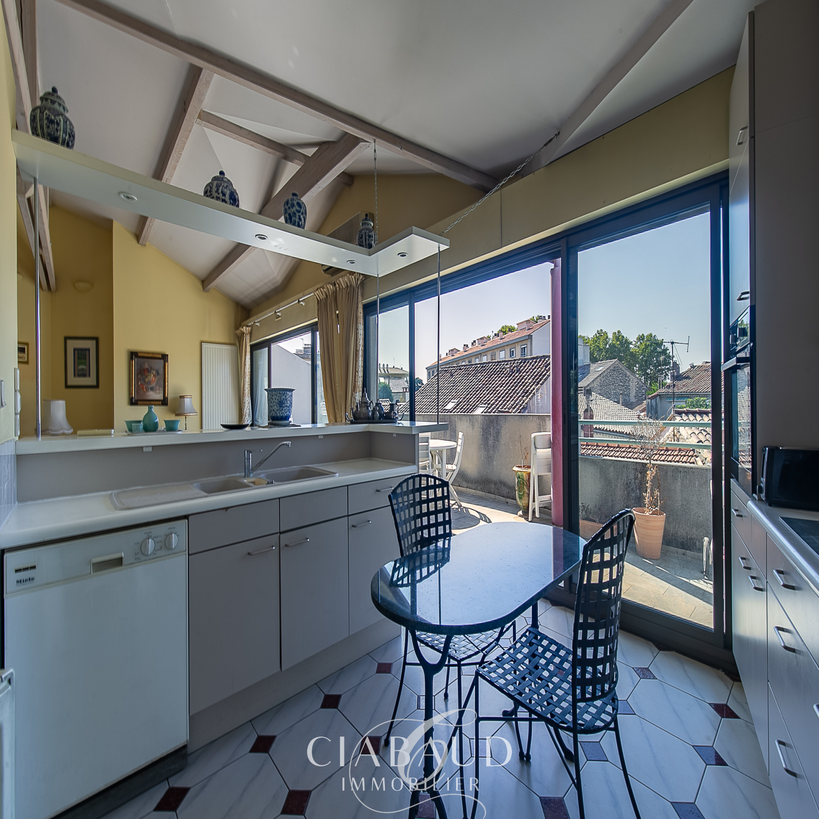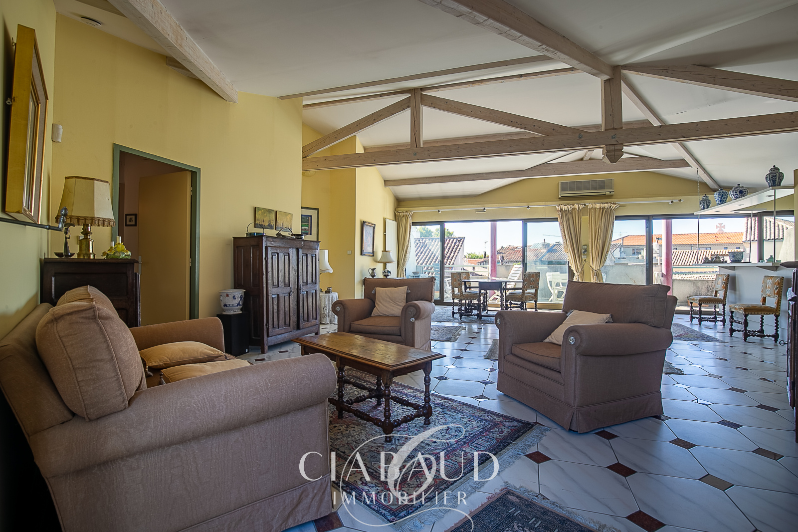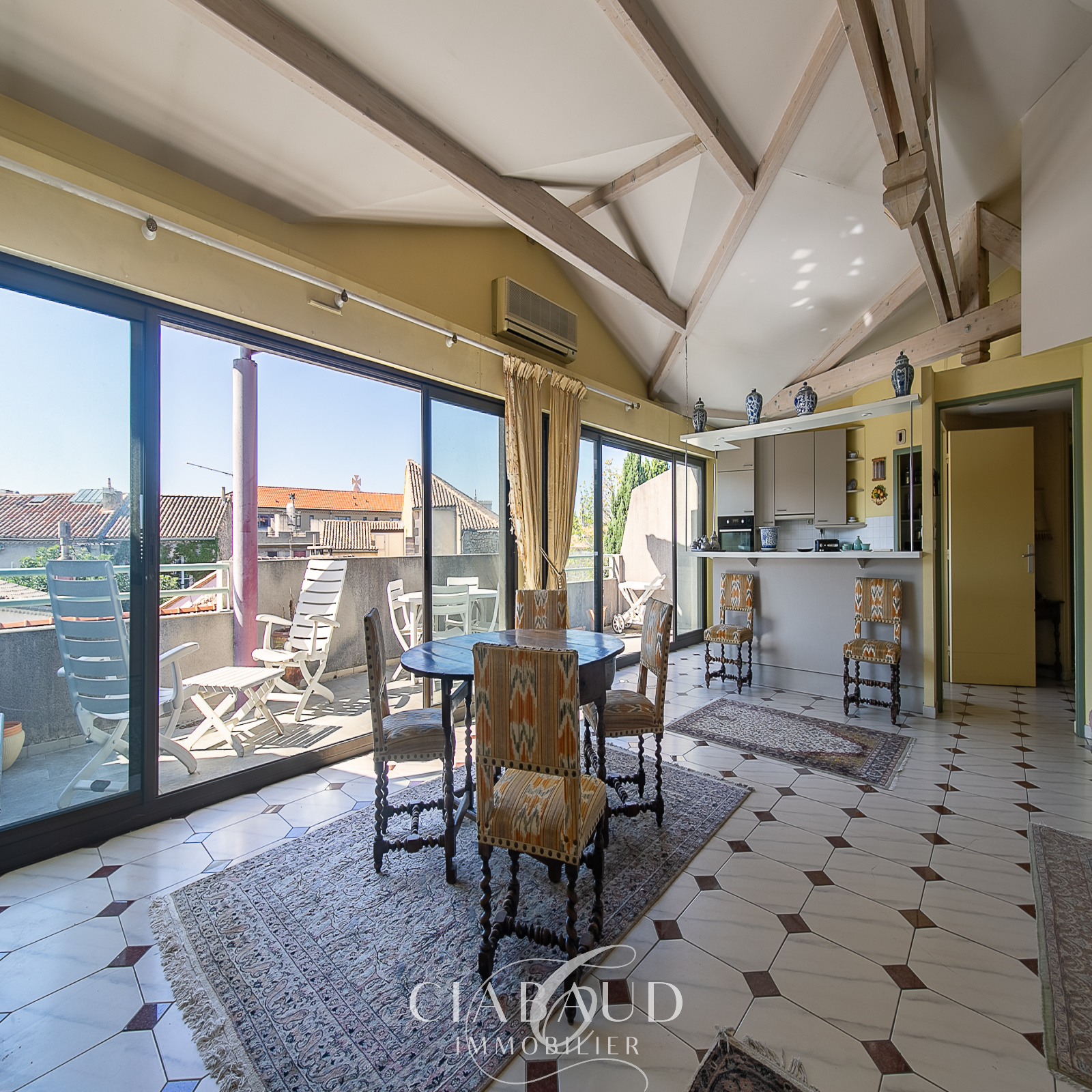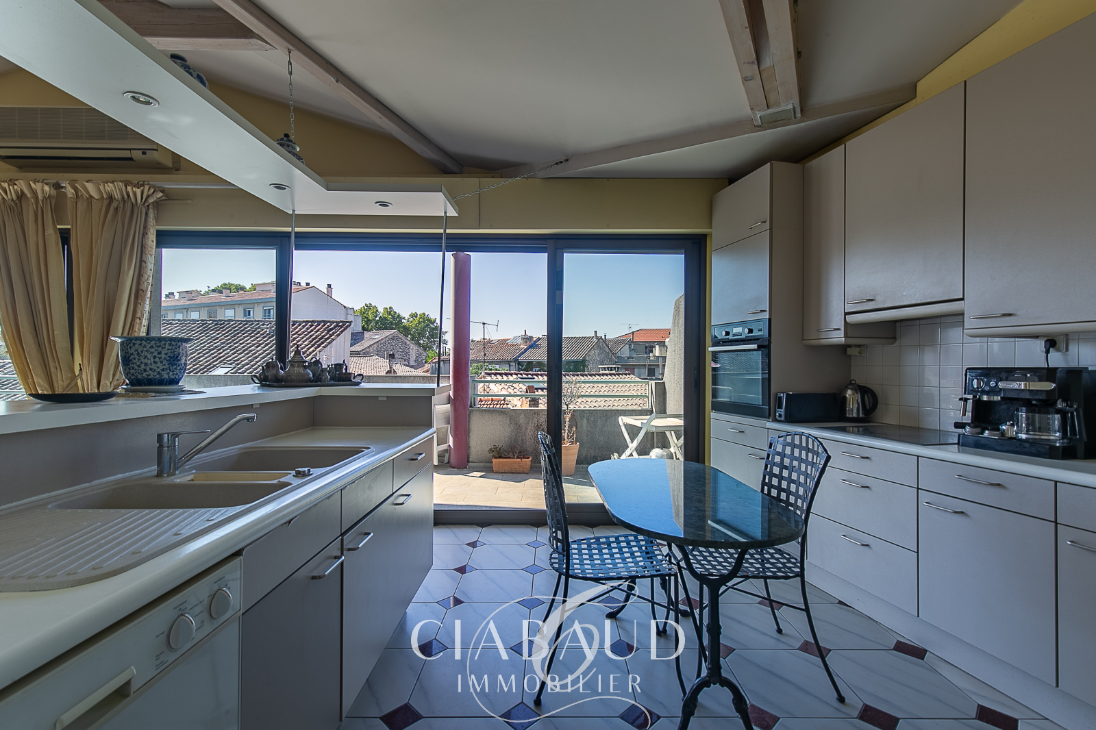 Idéalement situé dans le centre-ville historique d'Avignon, au calme, un appartement de standing avec le potentiel d'un penthouse de type 5 d'environ 153m2 avec terrasses, double garage et cave. Seul au dernier étage d'un immeuble des années 90 avec ascenseur, cet appartement avec ses beaux volumes et ses nombreuses terrasses vous permet de profiter de plusieurs expositions ainsi qu'une vue sur le Palais des Papes. Il est composé d'une grande pièce de vie traversante et climatisée de 66,5m2 avec cuisine américaine avec de grandes ouvertures sur la terrasse et une arrière-cuisine. Attenant une suite parentale d'environ 35m2 avec salle de bains, dressing, WC indépendant et un accès terrasse. Côté nuit, 2 chambres avec placard et accès terrasse, un bureau, deux salles d'eau et un WC indépendant. Chauffage individuel gaz et climatisation. Contact CIABAUD IMMOBILIER 04 42 53 35 13.