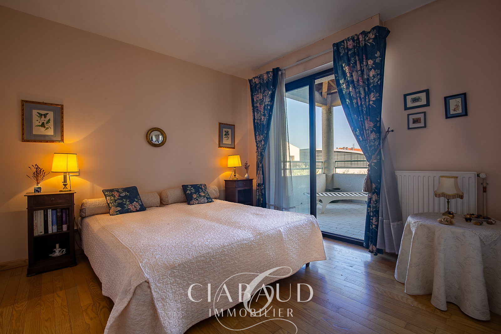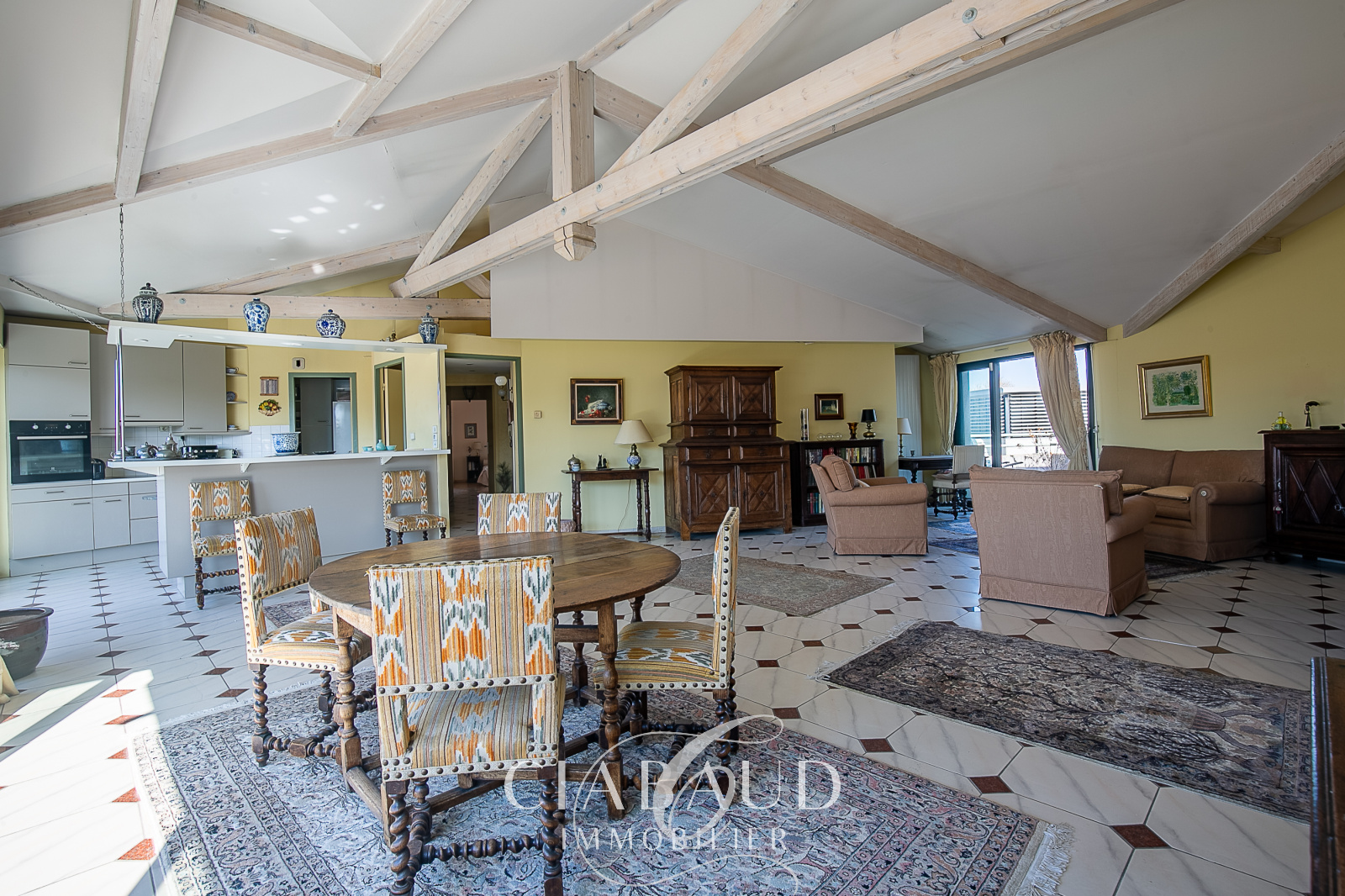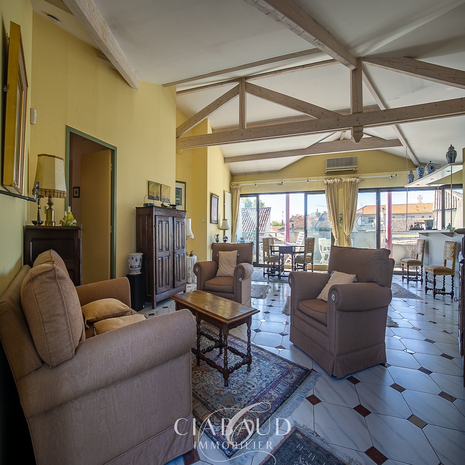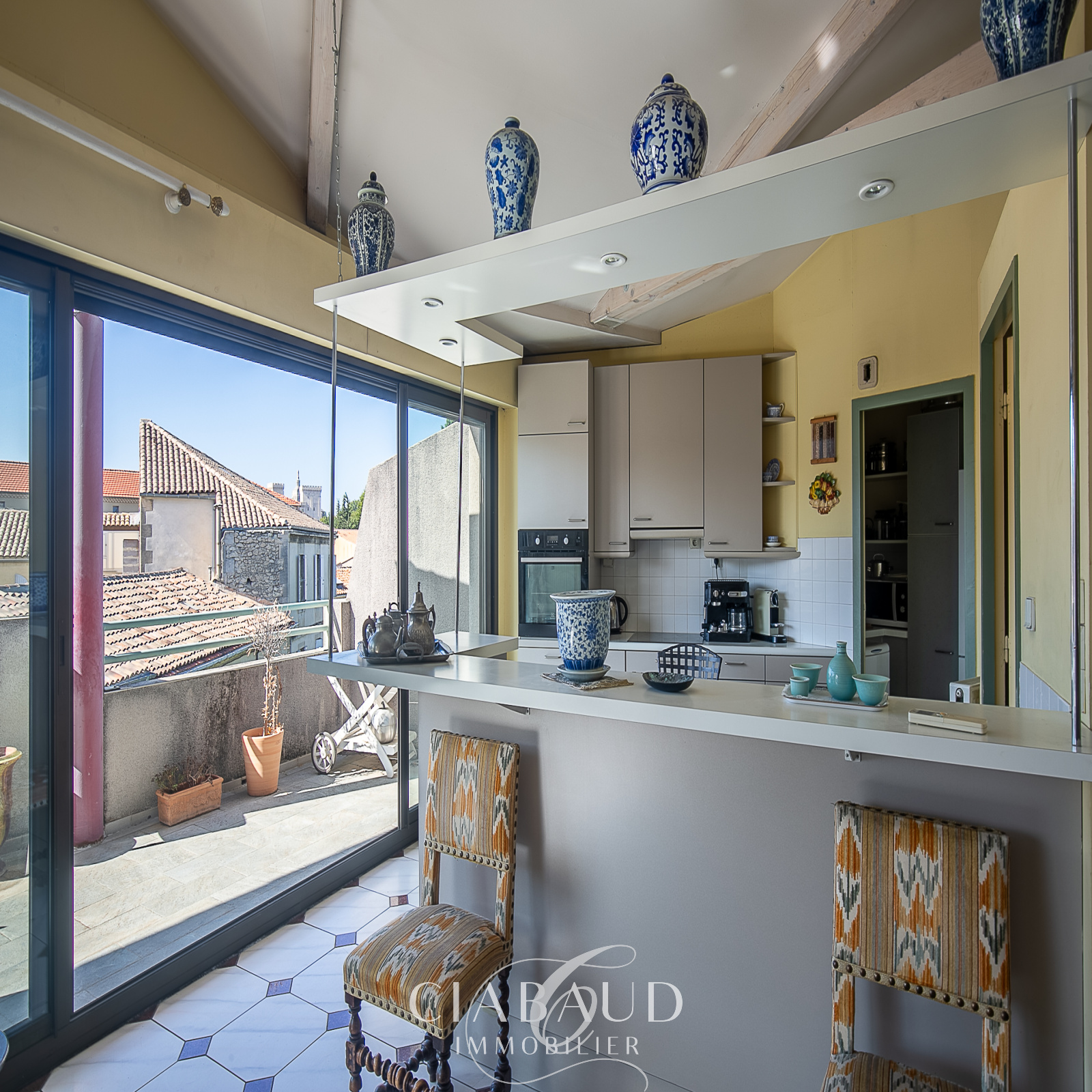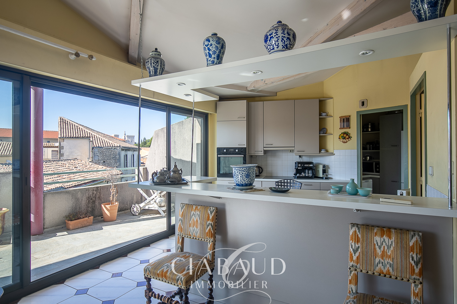 Idéalement situé dans le centre-ville historique d'Avignon, au calme, un appartement de standing avec le potentiel d'un penthouse de type 5 d'environ 153m2 avec terrasses, double garage et cave. Seul au dernier étage d'un immeuble des années 90 avec ascenseur, cet appartement avec ses beaux volumes et ses nombreuses terrasses vous permet de profiter de plusieurs expositions ainsi qu'une vue sur le Palais des Papes. Il est composé d'une grande pièce de vie traversante et climatisée de 66,5m2 avec cuisine américaine avec de grandes ouvertures sur la terrasse et une arrière-cuisine. Attenant une suite parentale d'environ 35m2 avec salle de bains, dressing, WC indépendant et un accès terrasse. Côté nuit, 2 chambres avec placard et accès terrasse, un bureau, deux salles d'eau et un WC indépendant. Chauffage individuel gaz et climatisation. Contact CIABAUD IMMOBILIER 04 42 53 35 13.
